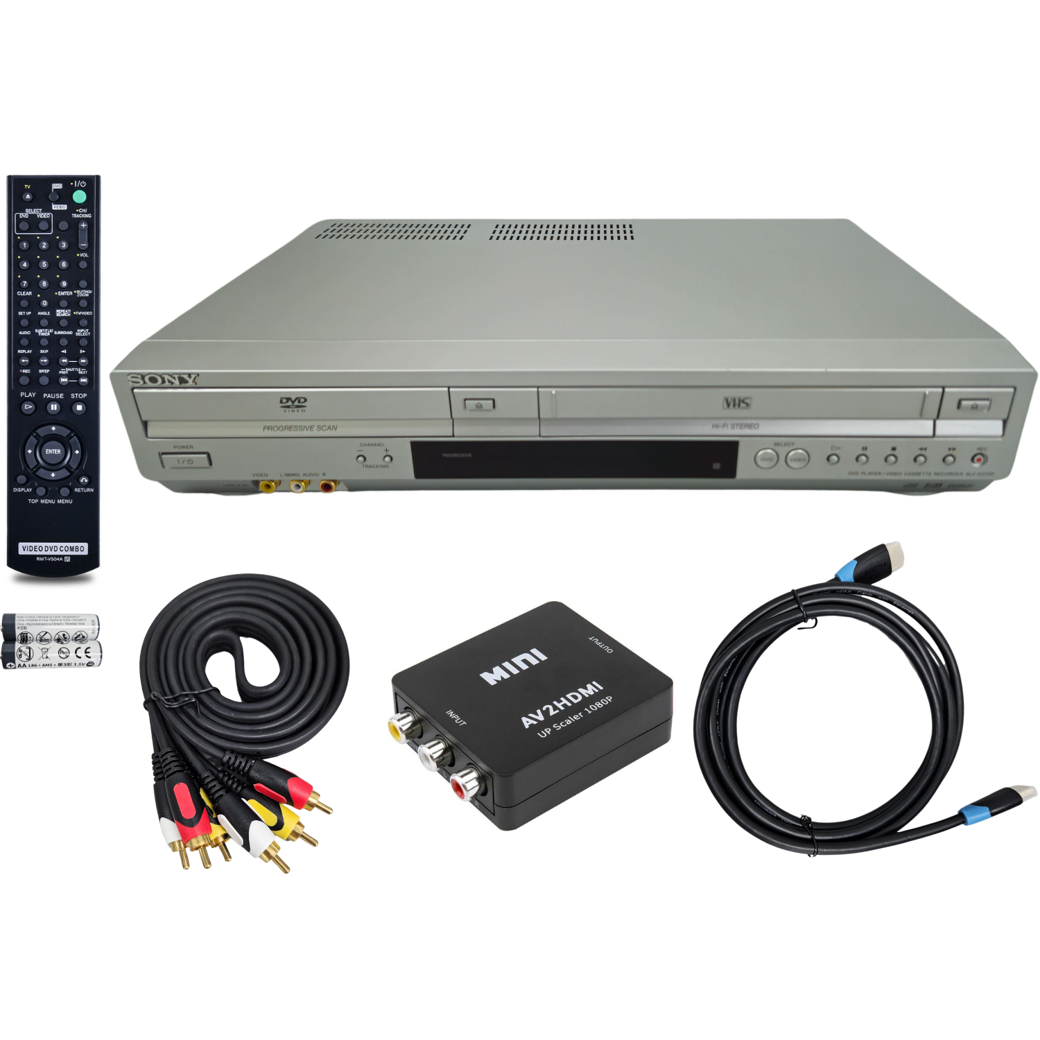 Includes Unit, Remote control with Batteries, RCA Cable, AV to HDMI Adapter, HDMI Cable, Quick Start guide, QR Code to Owners Manual